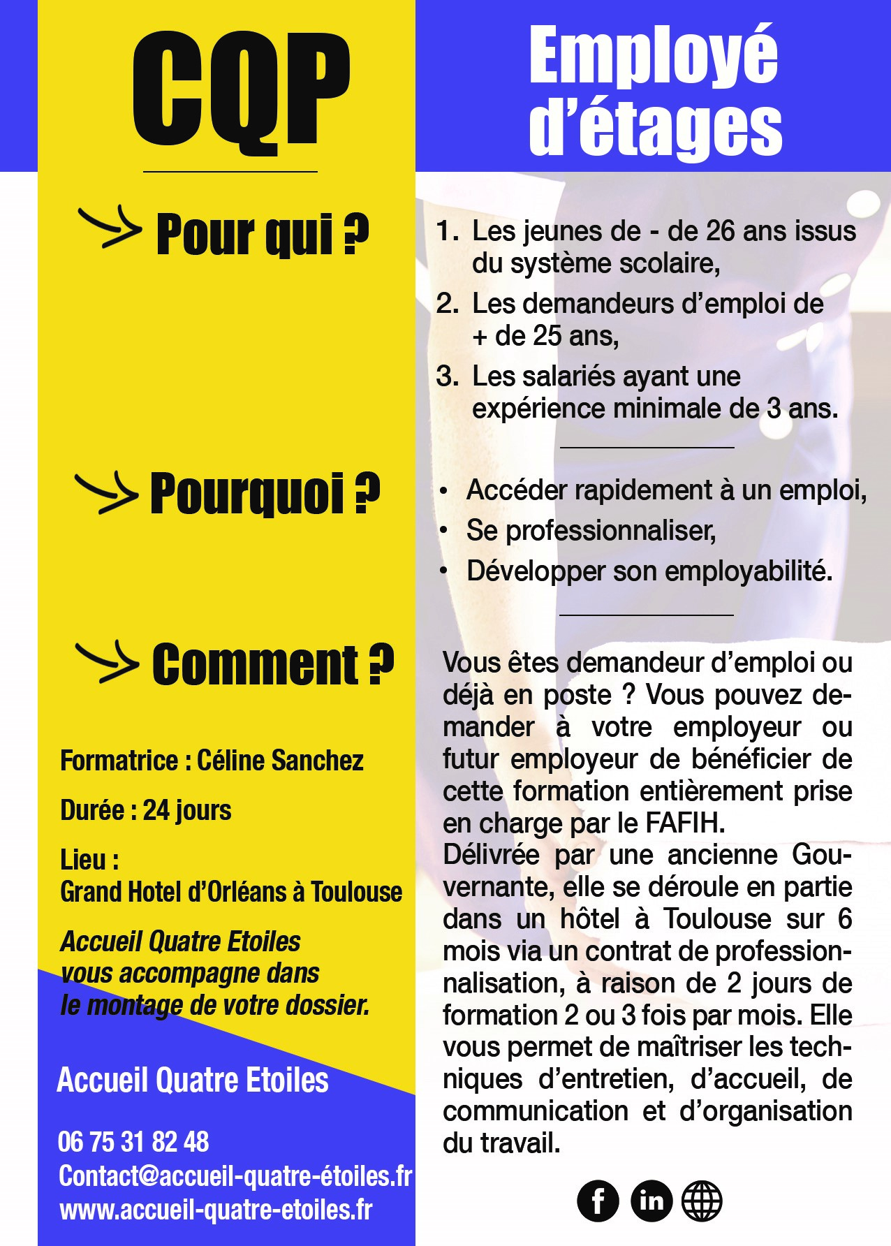 Nous proposons une formation diplômante au métier d’ Employé(e) d’Etages en Hôtellerie :
