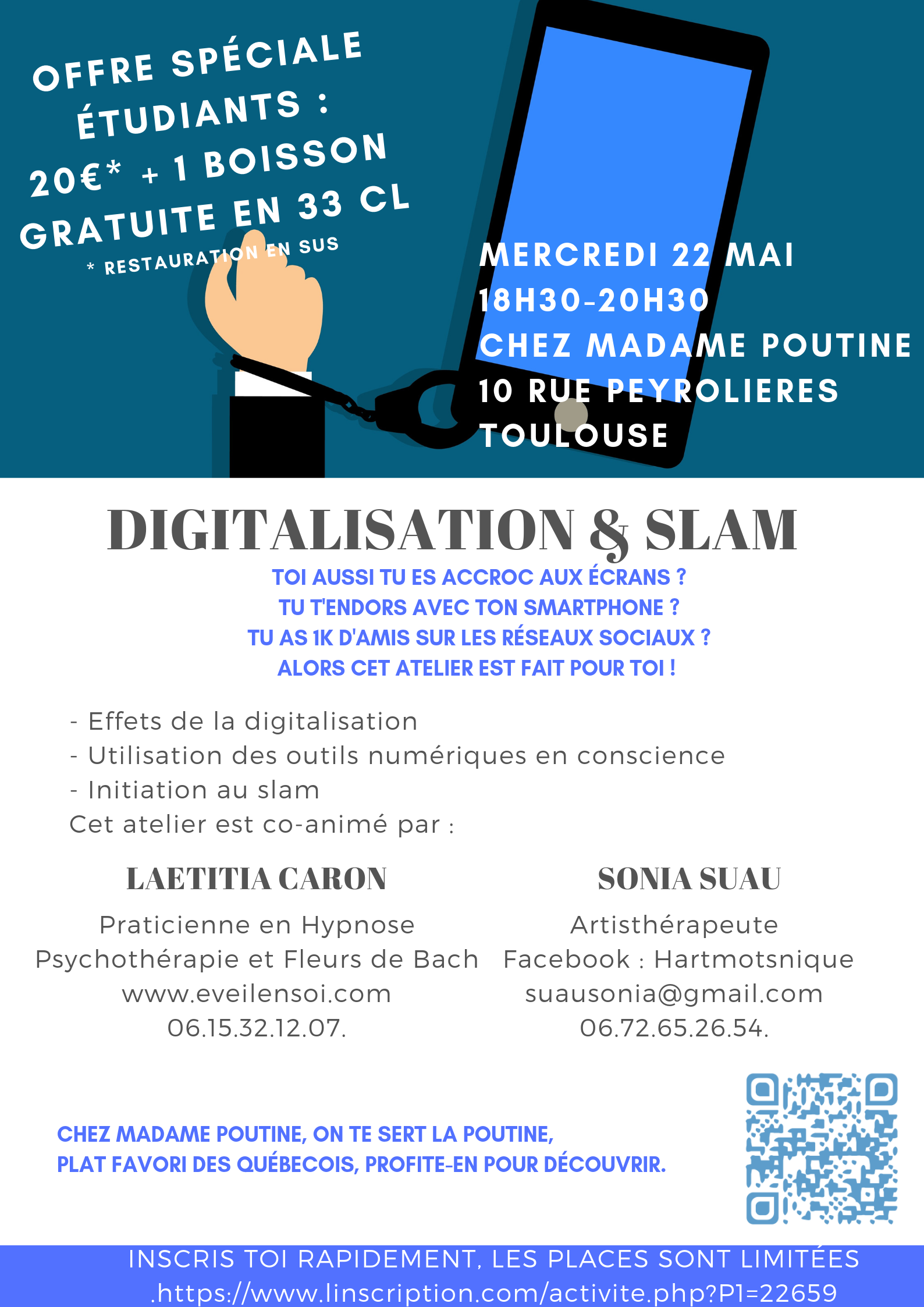 Laetitia Caron, je suis ravie de co-animer cet atelier réservé aux étudiants, avec Sonia Suau, artisthérapeute, sur la sensibilisation aux effets du digital et à la créativité par le slam, le mercredi 22 mai 2019 de 18h30 à 20h30 à Toulouse chez Madame Poutine (rue Peyrolières).
