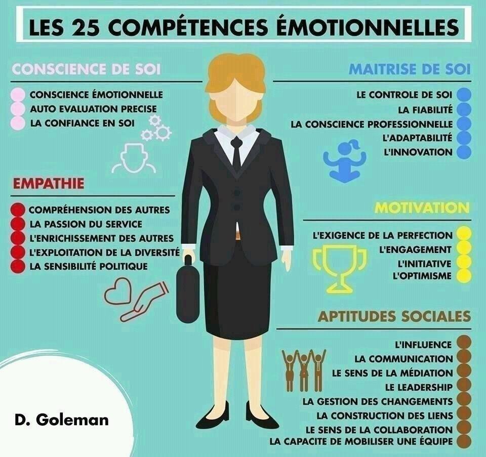 Voici une synthèse des 25 compétences constituant l’intelligence émotionnelle définie par Daniel Goleman.